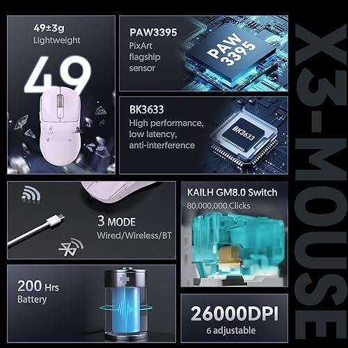 ATTACK SHARK X3 Wireless Gaming Mouse, 49g Bluetooth/2.4G/USB-C Ergonomic Computer Mouse, PAW3395 26K DPI Sensor, 200h Battery Life, Programmable Buttons, Gaming Accessories for PC/Laptop/Mac