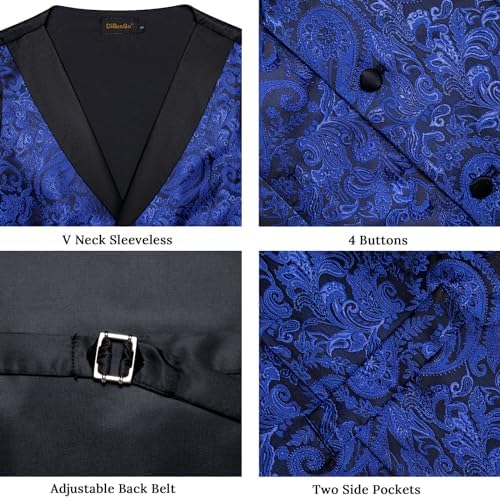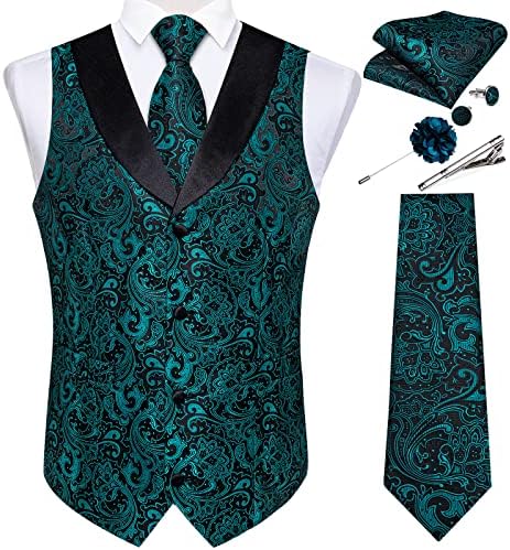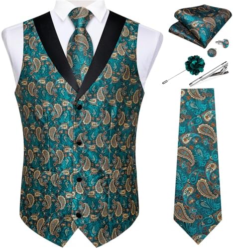 DiBanGu Mens Paisley Suit Vest Silk Jacquard Waistcoat and Necktie Set Formal Shawl Collar Dress Vest 7PCS for Wedding Party