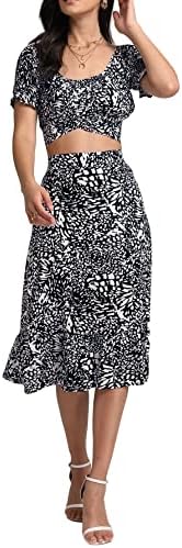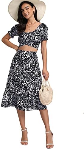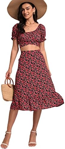 LYANER Women's 2 Piece Outfits Floral Self Tie Knot Crop Top and Midi Skirt Set