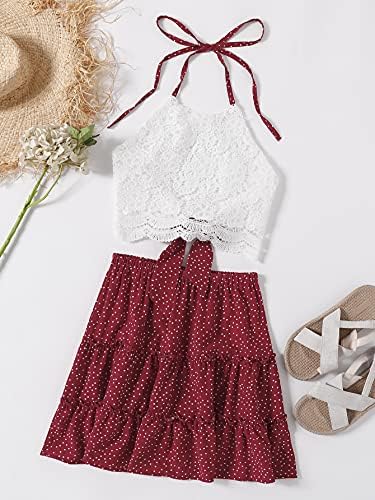 LYANER Women's 2 Piece Outfits Summer Lace Halter Cami Crop Top with Floral Mini Skirt Set
