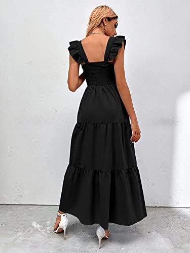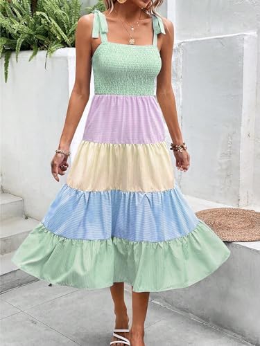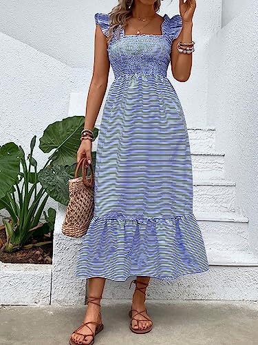 chouyatou Women's Retro Plaid Smocked Dress Spaghetti Strap Flounce Long Dress