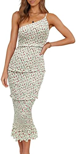PRETTYGARDEN Womens Floral Summer One Shoulder Strappy Tiered Ruffle Midi Bodycon Dresses