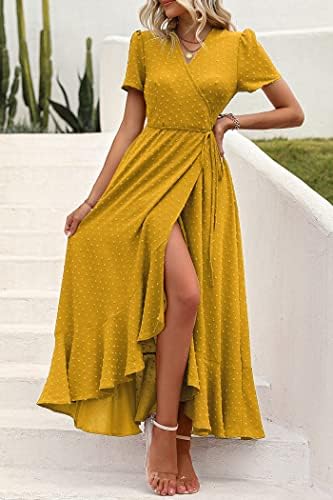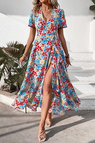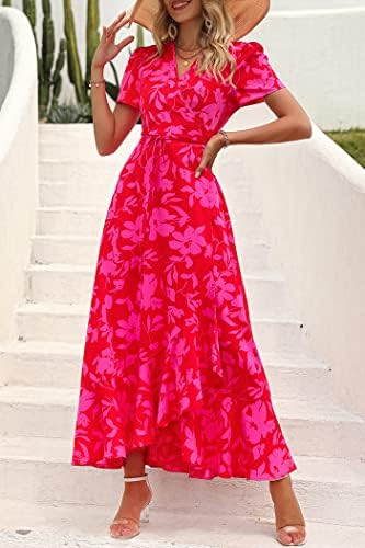 PRETTYGARDEN Womens Summer Wrap Maxi Dress Casual Boho Floral V Neck Short Sleeve Ruffle Hem Split Beach Long Dresses