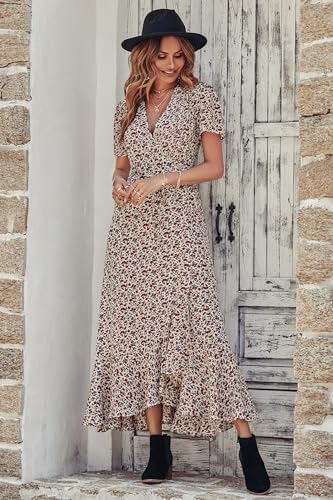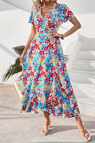 PRETTYGARDEN Womens Summer Wrap Maxi Dress Casual Boho Floral V Neck Short Sleeve Ruffle Hem Split Beach Long Dresses
