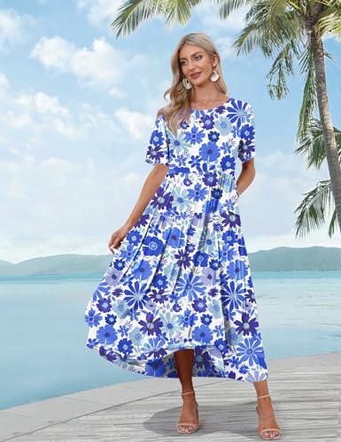 YESNO Women Casual Loose Bohemian Floral Dress with Pockets Short Sleeve Long Maxi Summer Beach Swing Dress EJF