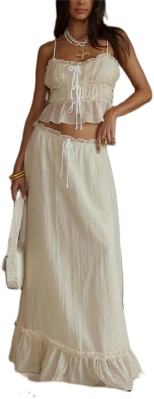 Yuemengxuan Women Y2k Ruffle Maxi Skirts Sets 2 Pieces Going out Set Sleeveless Lace Trim Cami Top Flowy Ruffle Long Skirts